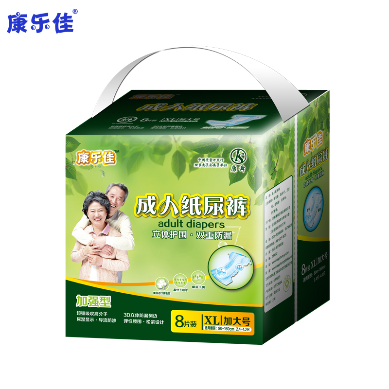 Xinkanglejia diapers have strong water locking ability, good air permeability, high elasticity and leak proof design. They are divided into three layers from the inside to the outside. The inner layer is close to the skin and is made of non-woven fabric; The middle layer is water absorbing fluff pulp with high molecular absorbent added; The outer layer is waterproof plastic film.